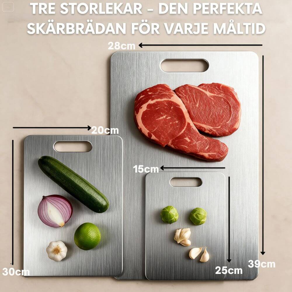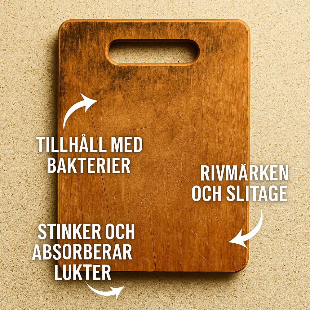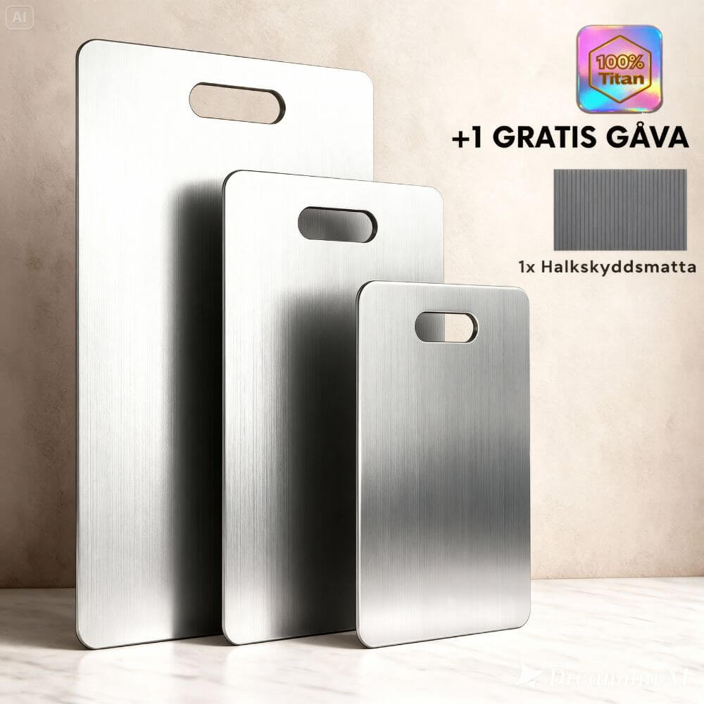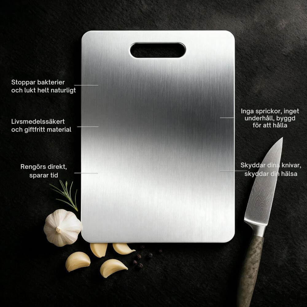 • Plast: Repor lätt, fångar bakterier och släpper mikroplaster • Trä: Suger åt sig fukt vilket leder till mögel och bakterier • Stål/glas: För hårt, gör knivar snabbt slöa • Titan: Ultrahygienisk, icke-porös, knivvänlig och byggd för att hålla en livstid
