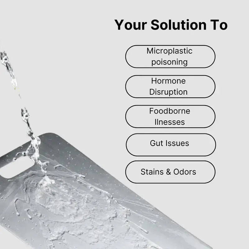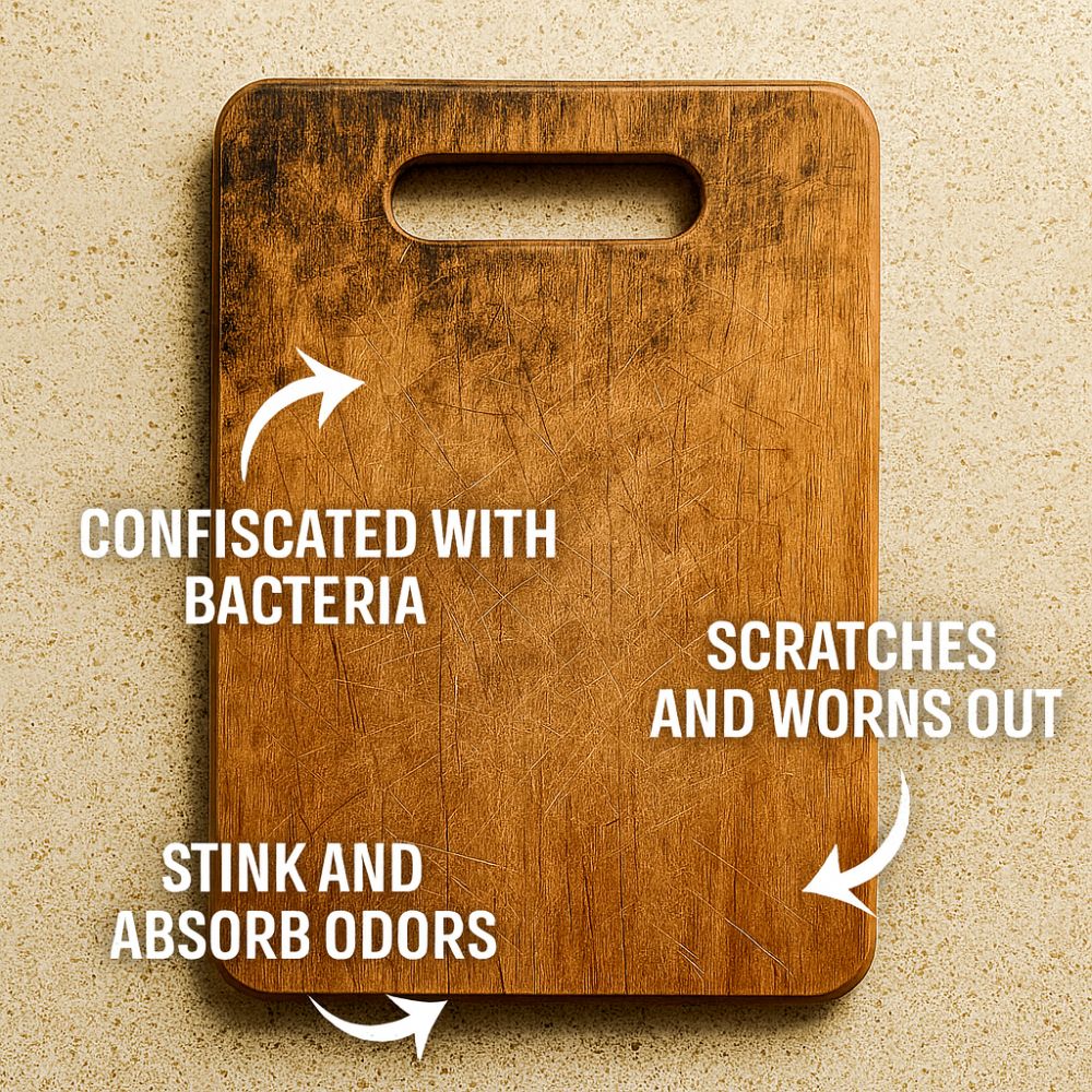 Plastic: Scratches easily, traps bacteria, and releases microplastics. Wood: Absorbs moisture, leading to mold and bacteria buildup. Steel/Glass: Too hard, causing knives to dull quickly. Titanium: Ultra-hygienic, non-porous, knife-friendly, and built to last a lifetime.