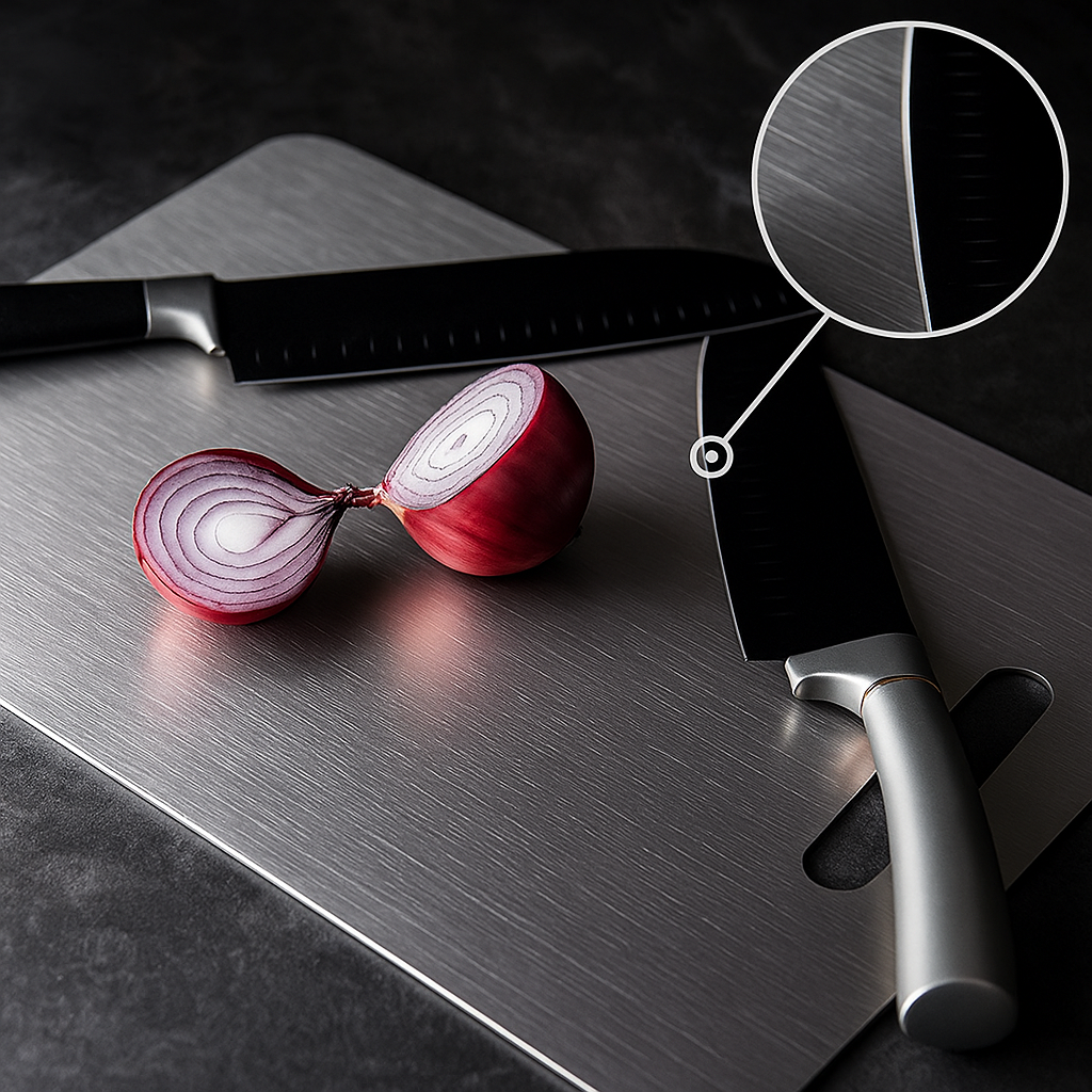 Titanium is gentler on knives than glass, stone, or steel due to its lower hardness (30-40 HRC). Most kitchen knives (55-62 HRC) dull quickly on harder surfaces like glass or steel (70+ HRC). Titanium absorbs impact without damaging blades, keeping them sharper for longer while maintaining a durable, stable cutting surface.